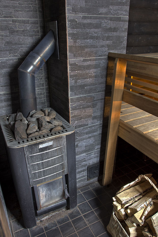 Saunarakennus sijaitsee joen varressa ja se on remontoitu vuonna 2012. Saunan ja pesuhuoneen lisäksi saunarakennuksesta löytyy pukuhuone varaavalla takalla.